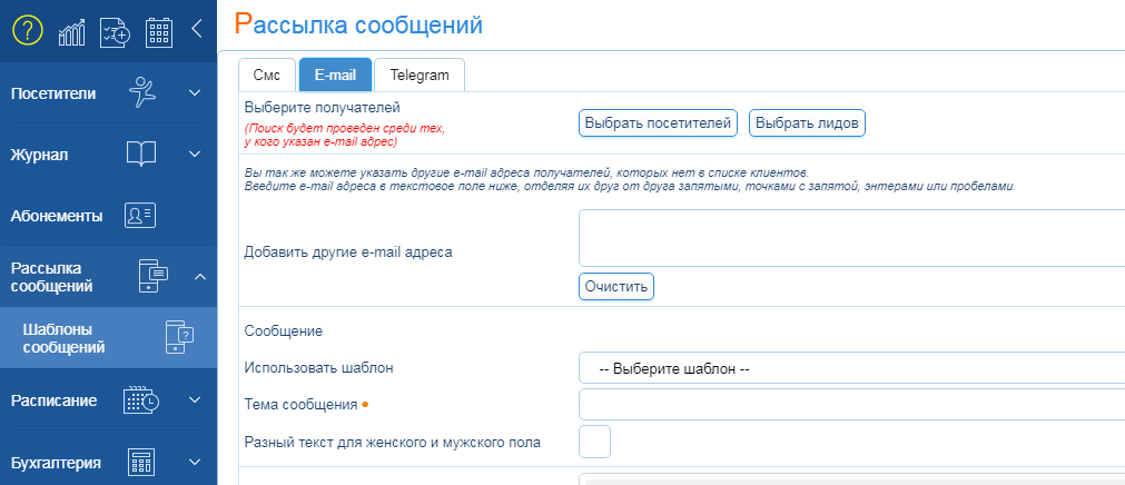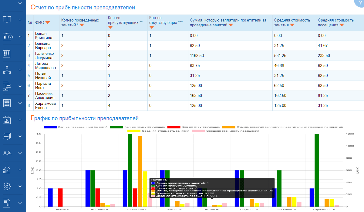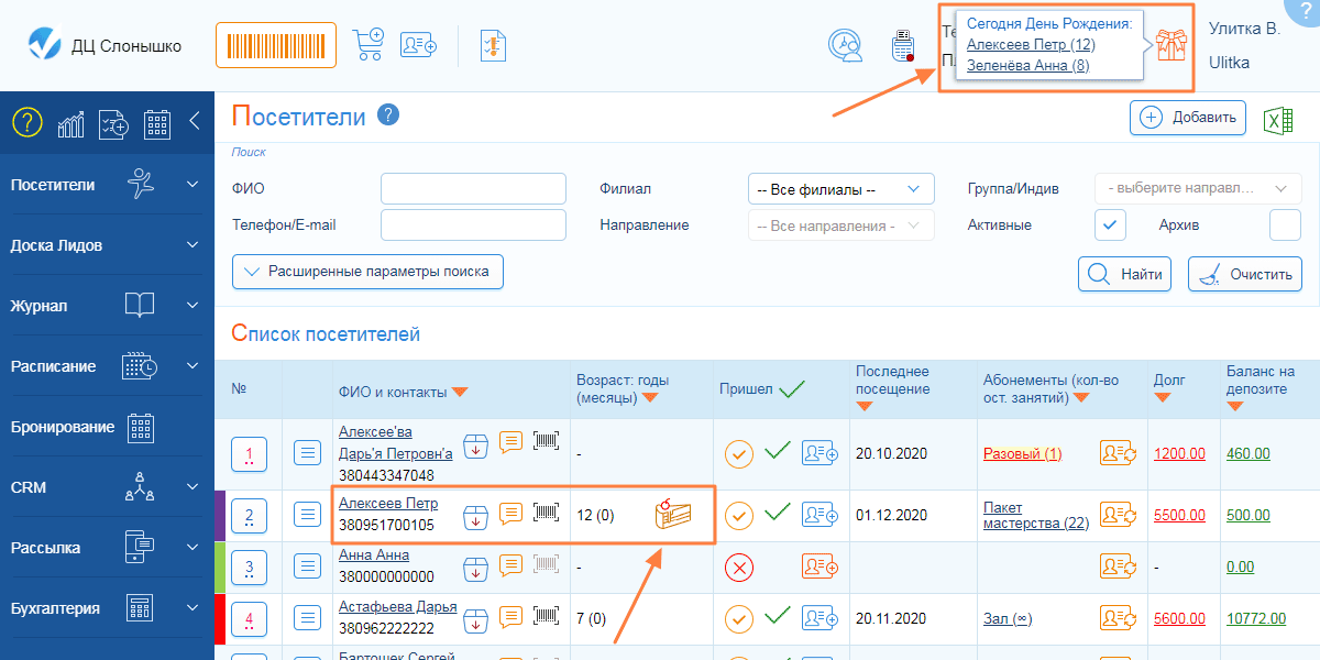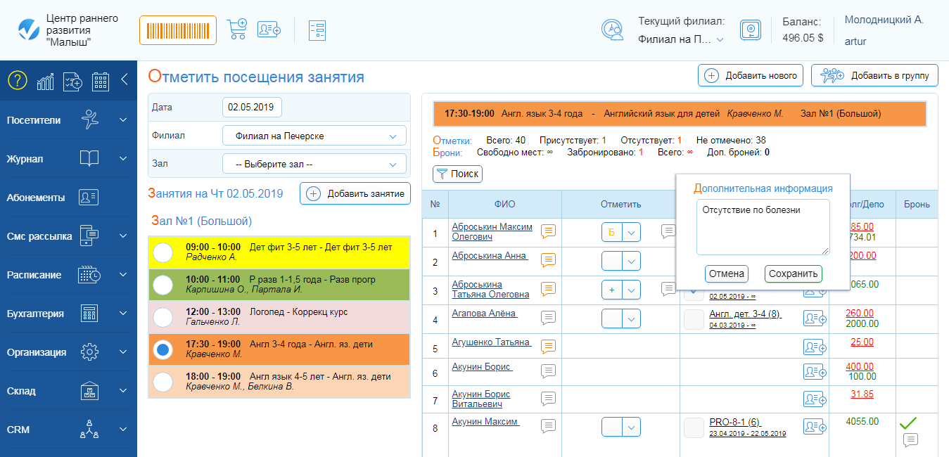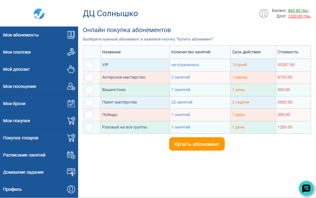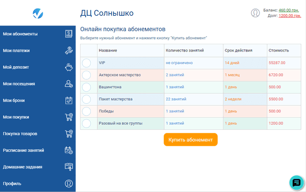 Функционал и меню в системе для танцевальных студий Отмечалка разработаны таким образом, чтобы администратор или менеджер могли понять назначение кнопок и полей, глядя на их название.