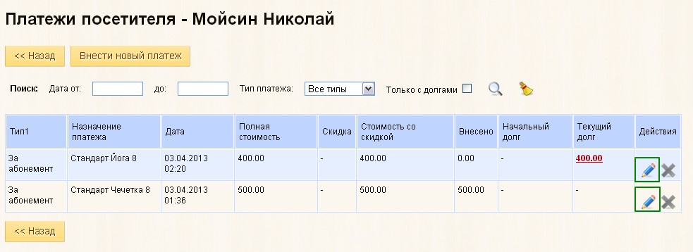 2. Добавлена возможность редактирования платежей посетителей