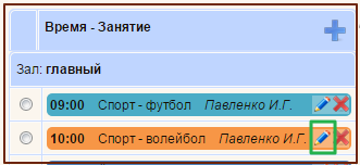 Для редактирования занятия кликните по выделенной кнопке в строке с занятием. После клика откроется окошко, в котором Вы сможете вносить правки в существующее занятие. После редактирования нажмите кнопку "Сохранить".