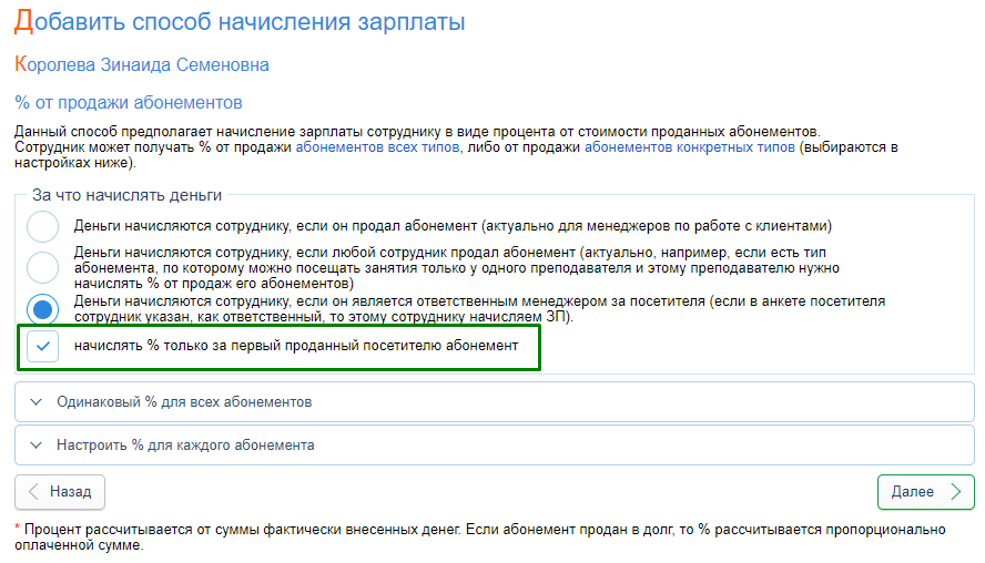 Добавили опцию “Начислять % только за первый проданный посетителю абонемент”.