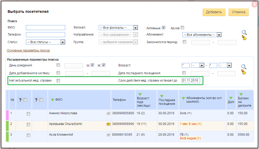 Используя данные фильтры в смс рассылке, Вы сможете разослать сообщения тем посетителям, у которых нет мед. справки, или срок ее действия истек/истекает.