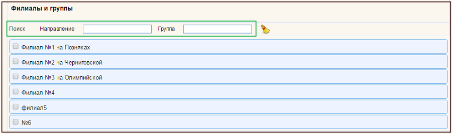 Начав вводить название направления или группы, раскроются списки филиалов и отобразятся те направления/группы, названия которых совпадают или содержат в себе введенный текст.