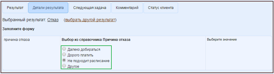 Например, для результата "Отказ" может быть справочник с причинами: далеко добираться, дорого платить, не подходит расписание или другое.
