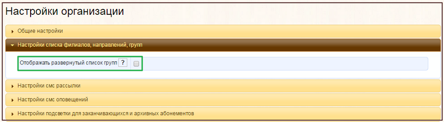 Если же Ваша организация имеет обширную сеть с большим выбором направлений и групп, то не ставьте галочку. В таком случае список филиалов с направлениями и группами будет свернут.