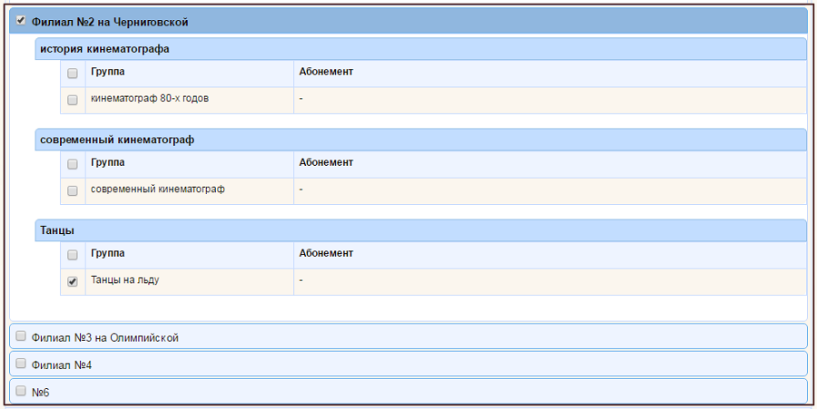 Если галочка стоит, то будет развернут список всех направлений-групп того филиала, в который записан посетитель.