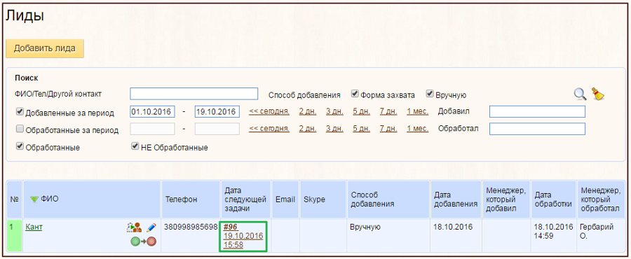 На странице Лиды в колонке "Дата следующей задачи" отображается номер задачи по лиду, а также дата и время выполнения данной задачи.