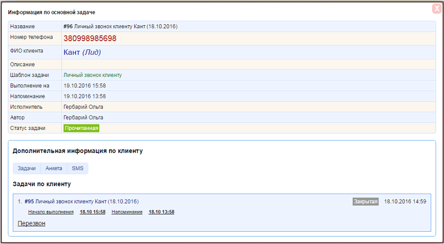 Номер задачи и дата/время являются ссылкой, при клике по которой открывается информация по основной задаче.