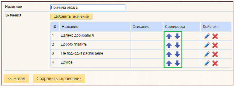 Добавив значения в справочник, перемещайте их вверх-вниз стрелками, добиваясь нужного порядка.