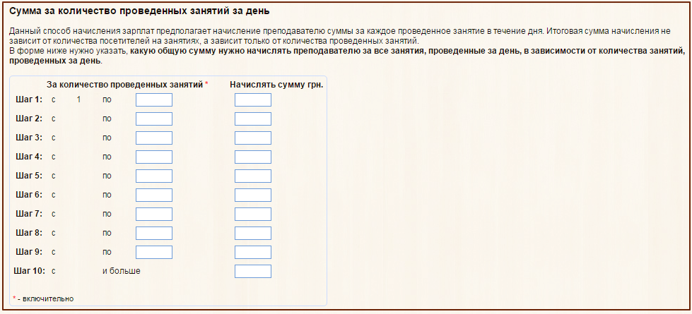 В блоке "За количество проведенных занятий» вы указываете количество занятий от и до, в блоке "Начислять сумму грн.» - указывайте сумму, которую преподаватель получит, проведя указанное количество занятий.