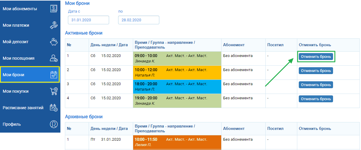 Кроме бронирования мест на занятиях, посетители также могут отменить свою бронь, перейдя во вкладку Мои брони и кликнув на “Отменить бронь”.