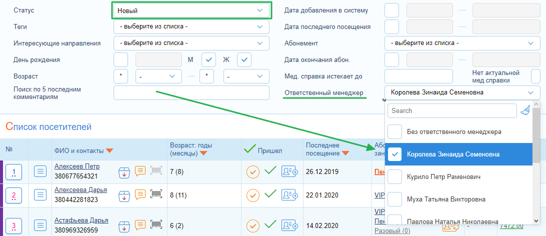 Прикрепить менеджера к клиенту Вы можете прямо в профиле лида/посетителя. Также на странице Посетители, воспользовавшись фильтрами, Вы можете проверить сколько посетителей привет тот или иной сотрудник.