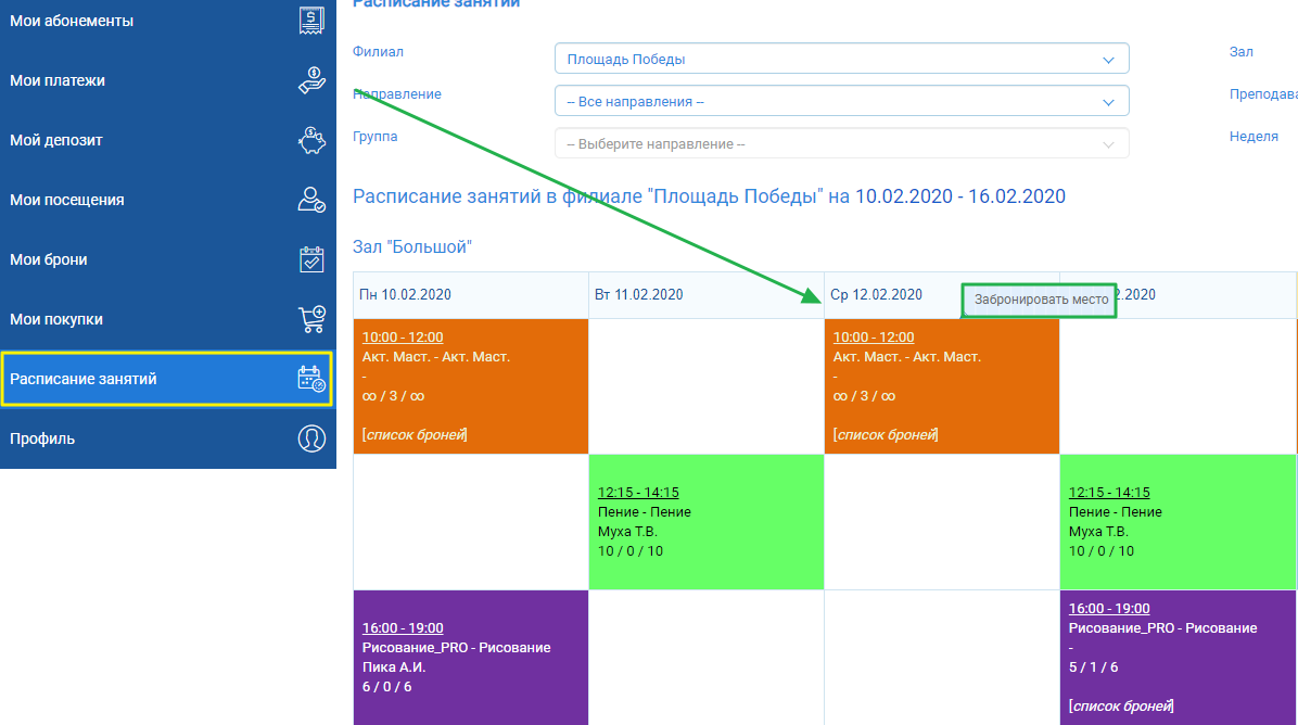 Для того, чтобы забронировать место на занятии, в Личном Кабинете откройте страницу Расписание и нажмите на будущее занятие.