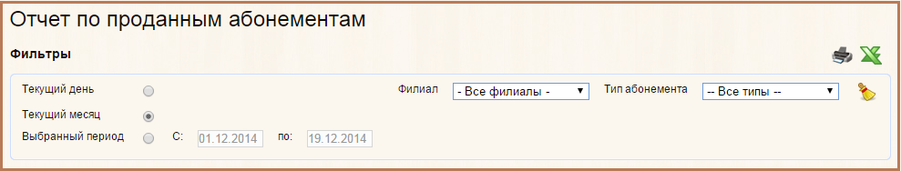 В блоке фильтров у Вас есть возможность выбрать период времени, за который были проданы абонементы.