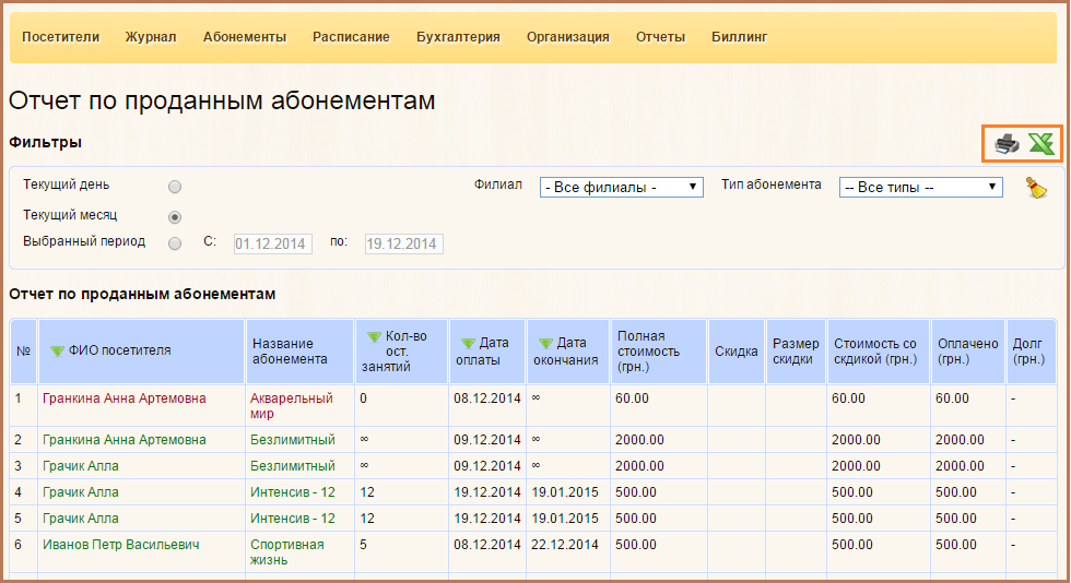Отчет по проданным абонементам доступен для вывода на печать и экспорта в таблицы Excel.