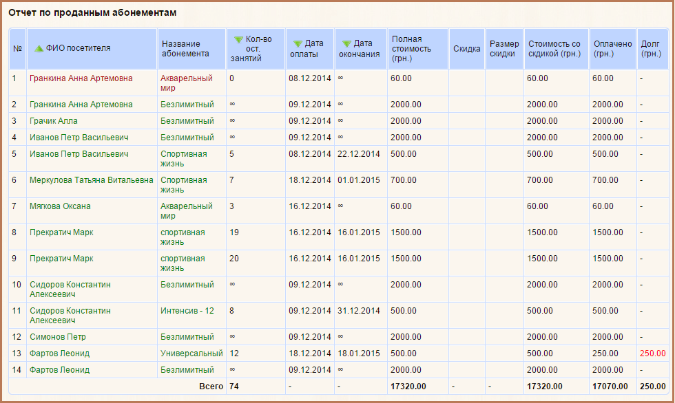 Если абонемент был оплачен не полностью (продан в долг), то в колонке "Долг (грн.)" отобразится сумма задолженности посетителя.