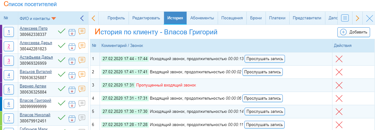 Добавили возможность записи звонков для IP-телефоний в CRM-Отмечалка. Чтобы прослушать звонки клиентам, перейдите в профиль клиента, во вкладку "История".
