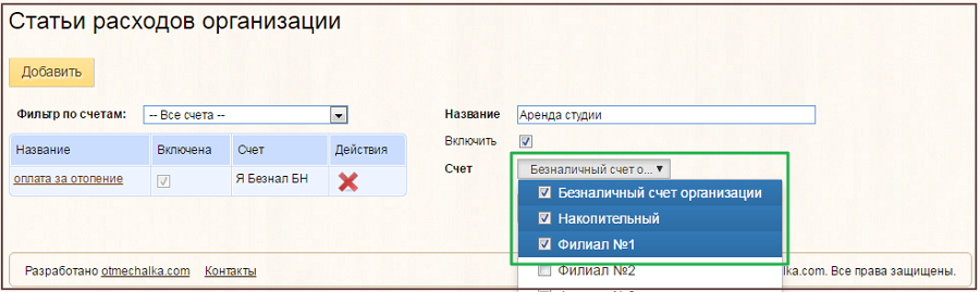 Создавая новую статью прихода или расхода, вы можете указать 2 и более счета, для которых они создаются.