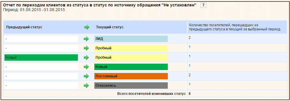Из данного отчета мы видим, что в статус Пробный перешли 2 клиента, один из них пришел из статуса Новый, а второй ранее не имел статуса.