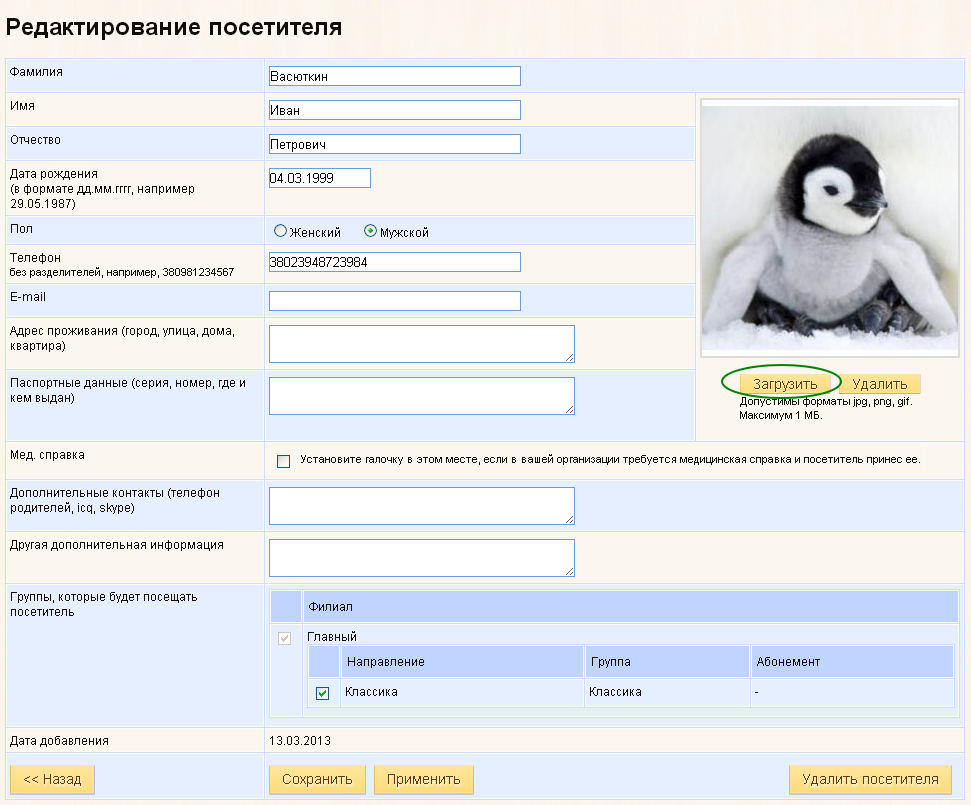 - Нажмите кнопку "Загрузить", в появившемся окне выберите файл с фотографией посетителя и нажмите кнопку "Открыть".
